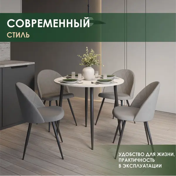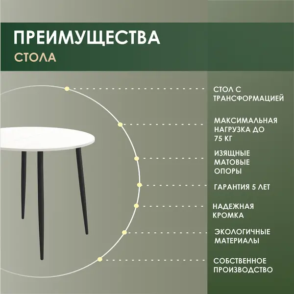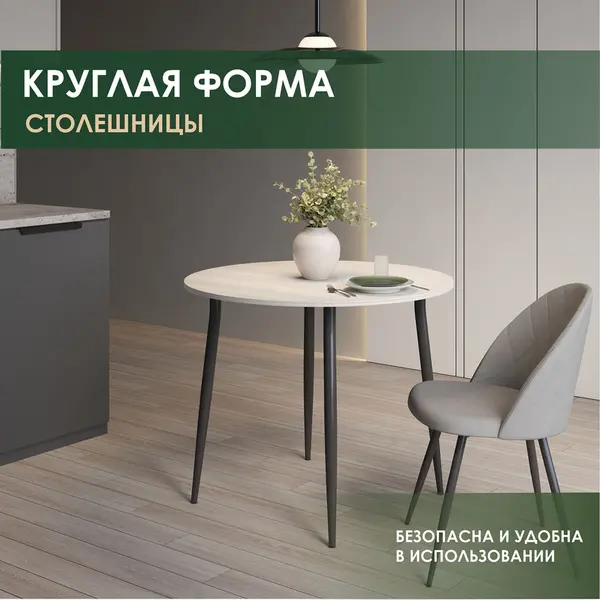 • Круглая форма столешницы — это отличный вариант для кухонного стола. Отсутствие острых углов делает его безопасным для маленьких детей и удобным для использования в небольших помещениях.