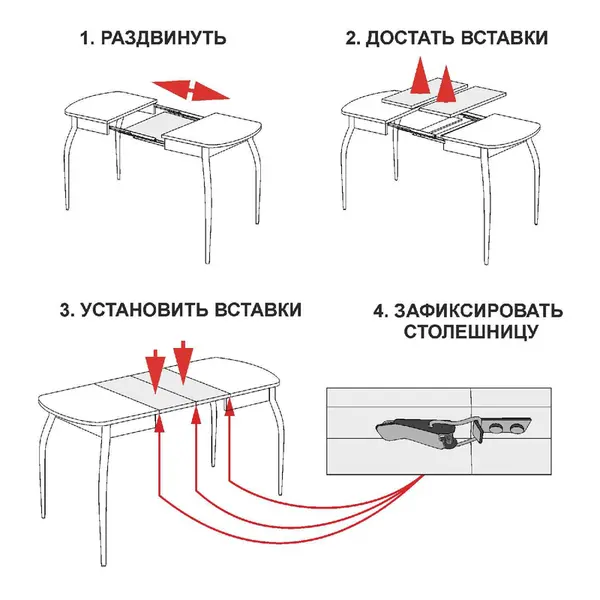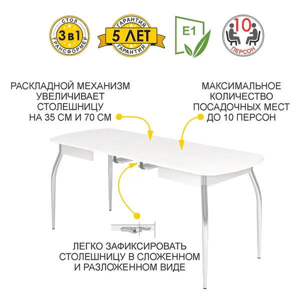 • Три варианта трансформации обеспечивает раздвижной механизм с двумя вставками, который увеличивает размер столешницы на 35 см и на 70 см.