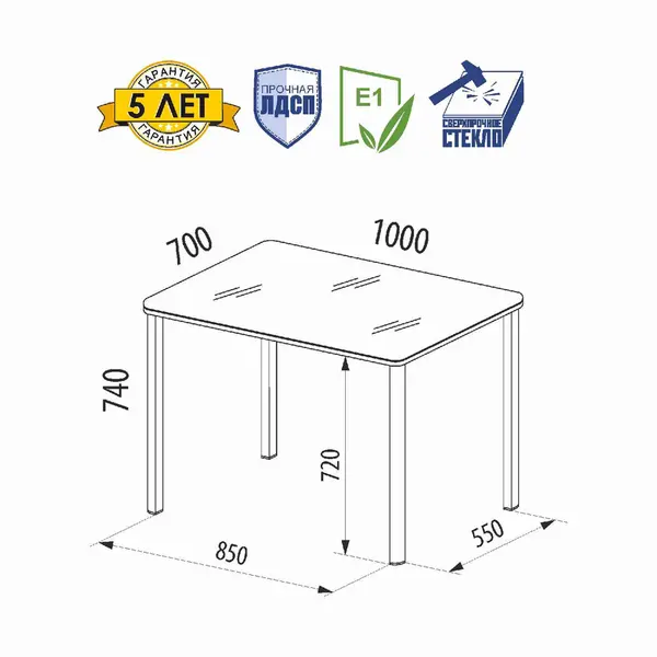 • Столешница выполнена из ЛДСП и стекла. ЛДСП повышенной прочности, материал устойчив к механическому истиранию и термическому воздействию. Выдерживает min 200 циклов истирания (по ГОСТу min 65) что больше, чем у многих производителей.