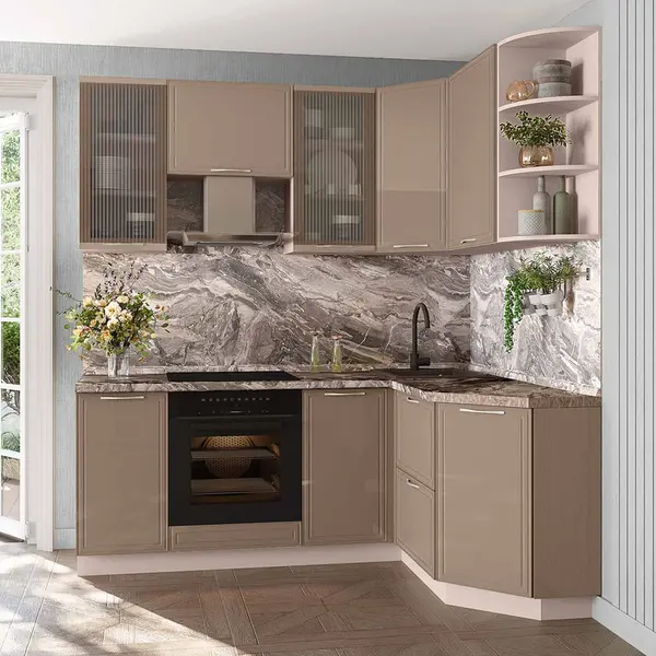 • Мягкий кофейный оттенок «Мокко» создает атмосферу спокойствия и уюта. Глянцевая поверхность фасадов с оригинальной рамкой поддерживает современный стиль.