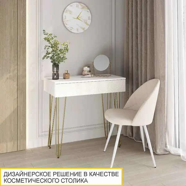 Туалетный столик выполнен в белом теплом цвете. Он выглядит естественно и идеально комбинируется с любой мебелью и аксессуарами. Такое сочетание является актуальной классикой гармоничного и стильного интерьера.