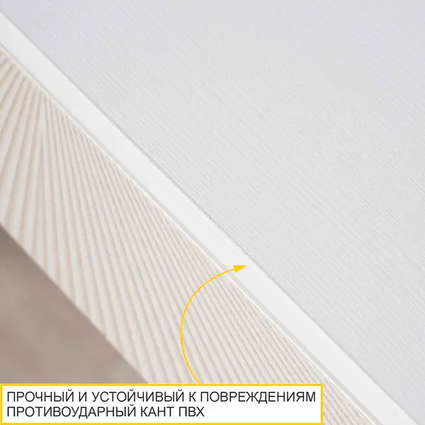 • Противоударный кант ПВХ толщиной 2 мм защищает края изделия от сколов и влаги, увеличивает срок эксплуатации изделия и сохраняет его внешний вид на долгие годы.