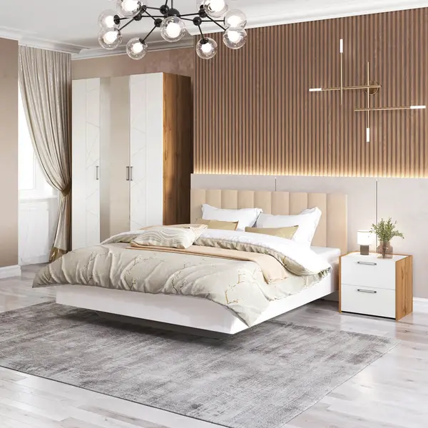 • Сочетание белоснежной поверхности фасадов «Синга крем» с благородной древесной текстурой «Дуб Вотан» подчеркивает изысканный дизайн коллекции.