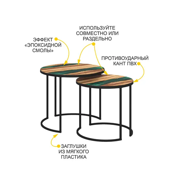 • Оригинальный комплект из двух журнальных столиков можно комбинировать по-разному, создавая интересные интерьерные решения. Столики 50 см и 60 см идеально дополняют друг друга, при этом каждый может использоваться самостоятельно. Это отличный вариант для применения в качестве кофейного и журнального столиков, прикроватной тумбы или изящного предмета декора. За одну цену Вы получаете два стола.