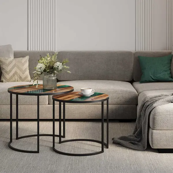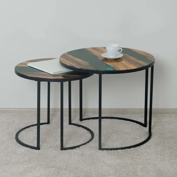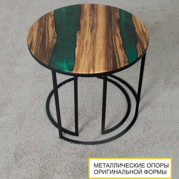 Теплый древесный оттенок столешниц журнальных столиков создает ощущение уюта и комфорта, а изумрудный цвет реки завораживает и наполняет пространство свежестью и гармонией природного стиля. Уникальный дизайн столика дополняют оригинальные «золотые» опоры.