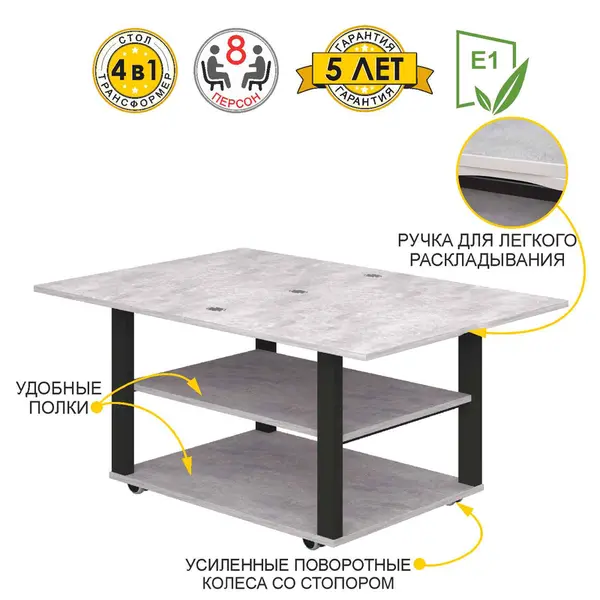 • Раскладной журнальный стол-трансформер легко превращается в обеденный или письменный стол и имеет четыре варианта трансформации. За одну цену Вы приобретаете 4 стола: 2 журнальных – один компактный, второй – с увеличенной столешницей, а также 2 обеденных стола на 4 и 8 персон.