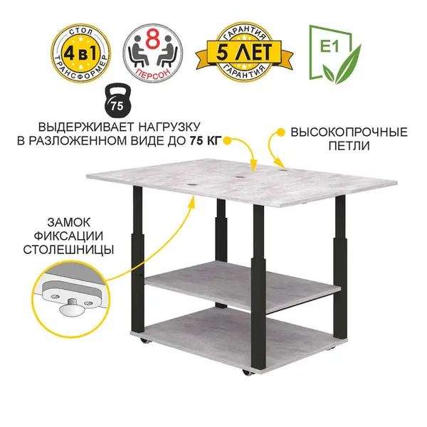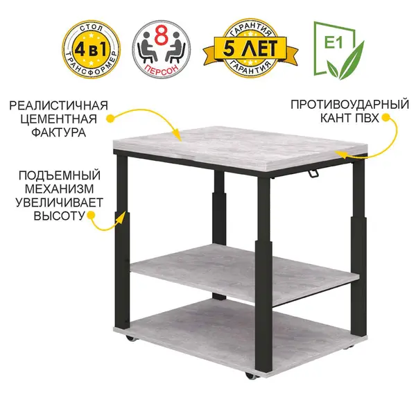 • Усиленные поворотные колеса со стопором позволяют зафиксировать стол в нужном положении для удобства его трансформации. Мебель проходит многочисленные испытания и тесты на качество. Гарантия качества от производителя – 5 лет. Это значительно больше, чем у многих производителей.