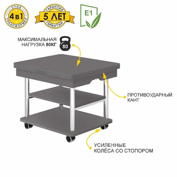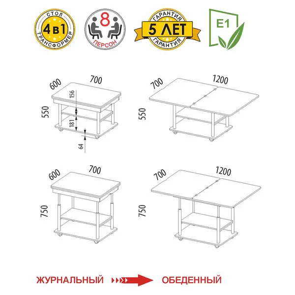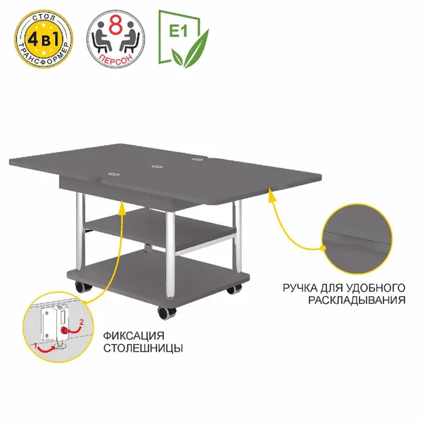 • Раскладной журнальный стол-трансформер легко превращается в обеденный или письменный стол и имеет четыре варианта трансформации. За одну цену Вы приобретаете 4 стола: 2 журнальных - один компактный, второй - с увеличенной столешницей, а также 2 обеденных стола – на 4 и 8 персон.