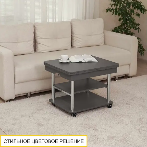 Журнальный столик выполнен в сером цвете. Такой цвет является базовым, он прекрасно сочетается с различными оттенками и может быть с успехом применен в разнообразных стилевых решениях.
