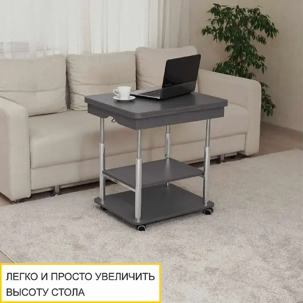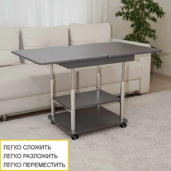 • Подъемный механизм легко и просто позволяет преобразовать журнальный стол в обеденный, увеличивая высоту до 75 см. Благодаря подъемному механизму стол может использоваться как кофейный столик, а также как полноценный стол для кухни или для гостиной.