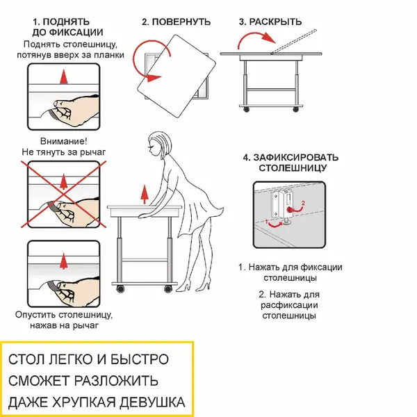 • Благодаря удобному механизму трансформации стол легко и быстро сможет разложить даже хрупкая девушка. Для того чтобы процесс трансформации был ещё удобнее и проще, мы рекомендуем использовать удобную ручку для раскладывания и замок фиксации столешницы.