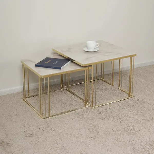 Журнальный стол Рим 45 - это идеальное решение для тех, кто ценит стиль и функциональность в интерьере. Этот комплект квадратных столиков станет не только практичным элементом вашей гостиной, но и настоящим украшением. Журнальные столики выполнены в трендовом сочетании бежевого «мрамора» и «золота».