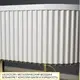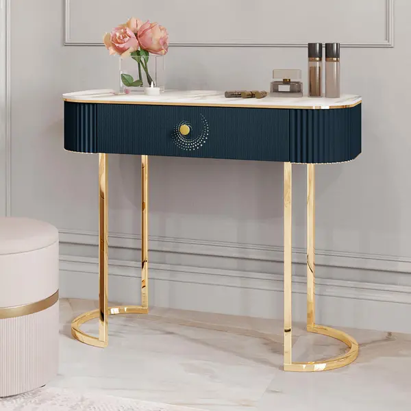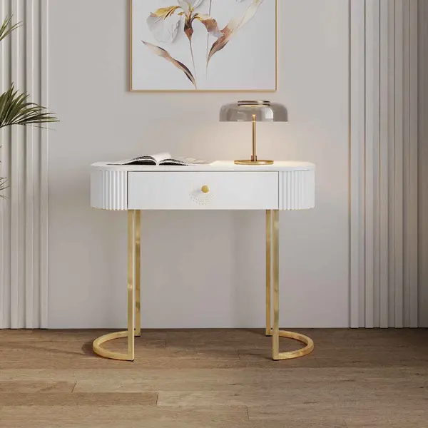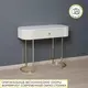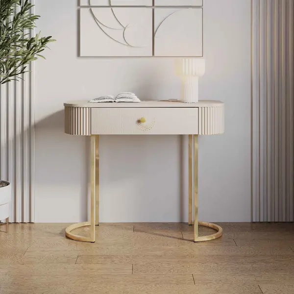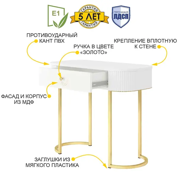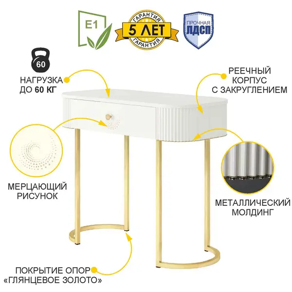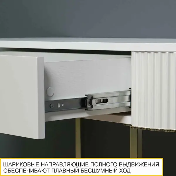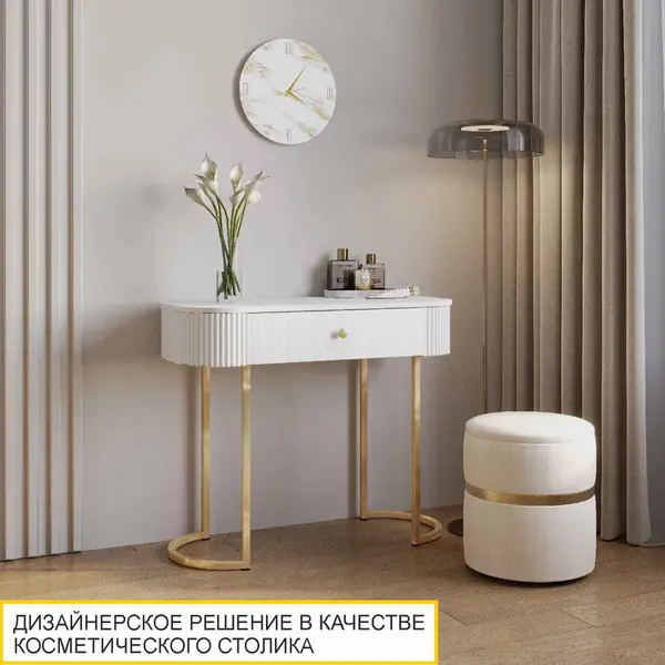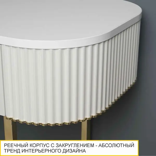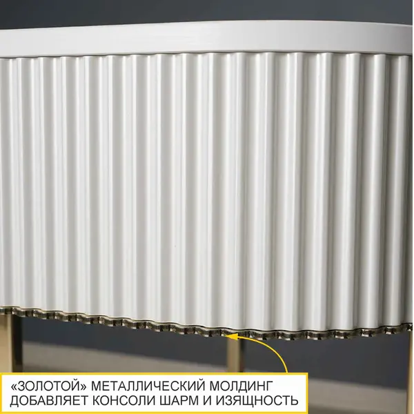 • Золотой металлический молдинг добавляет косметическому столику шарм и повторяет геометрию реечного фасада.
