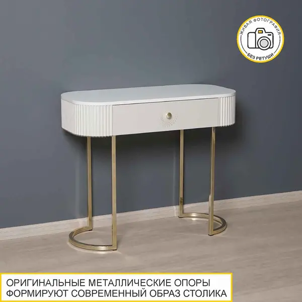 Туалетный столик выполнен в теплом белом цвете с роскошными золотыми опорами. Он выглядит гармонично и идеально комбинируется с любой Вашей мебелью и аксессуарами. Такое сочетание является актуальной классикой.