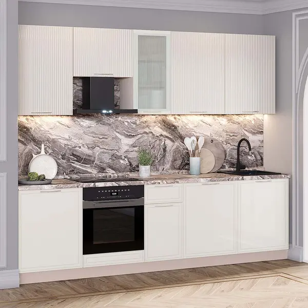 • Глянцевые фасады с оригинальной рамкой и актуальной фрезеровкой «рейки» поддерживают современный стиль, добавляя интерьеру ритмичности и утонченности.