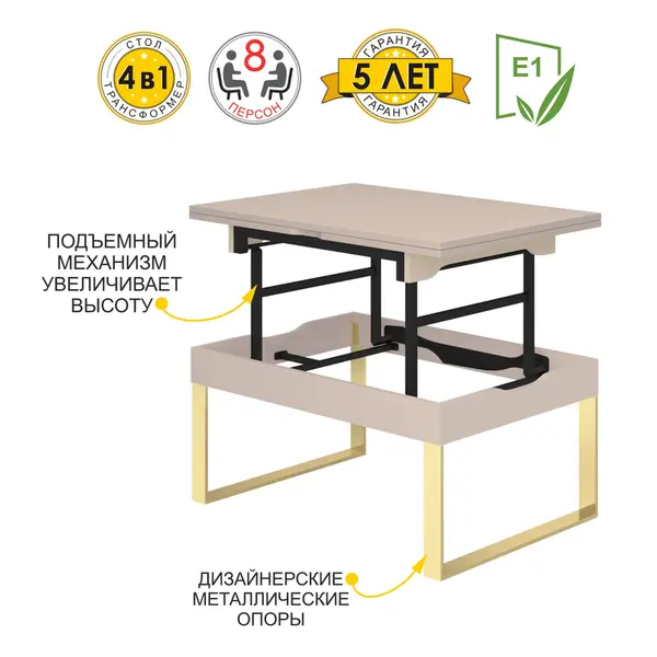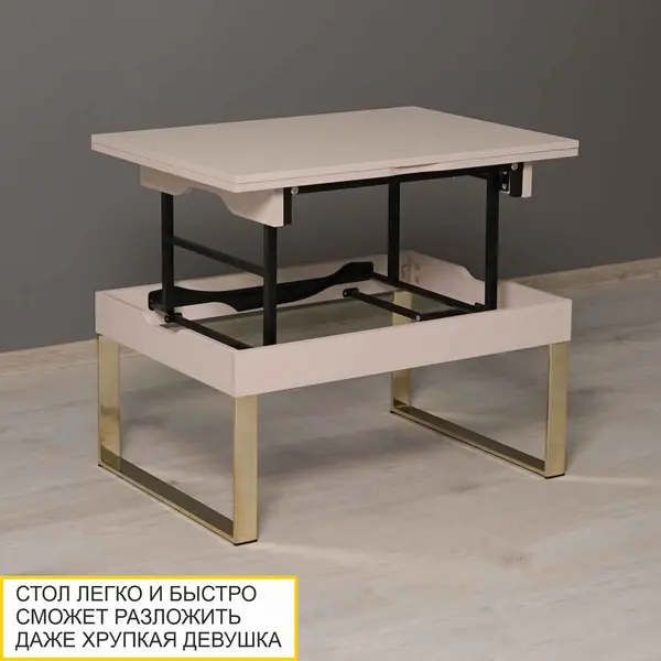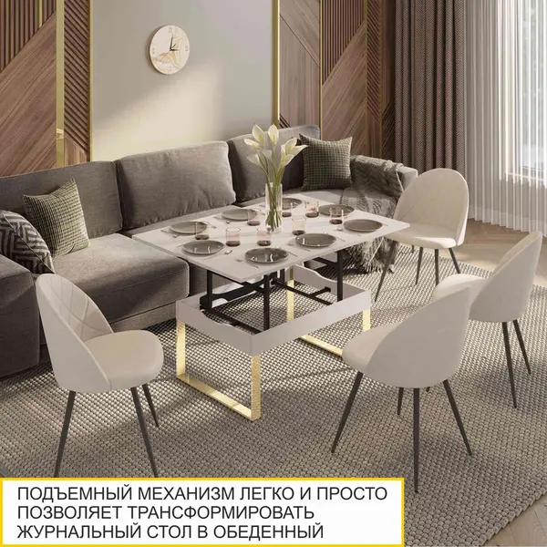 • Подъемный механизм легко и просто позволяет трансформировать журнальный стол в обеденный, увеличивая высоту до 30 см. Благодаря подъемному механизму стол может использоваться как кофейный столик, а также как полноценный стол для кухни или для гостиной.