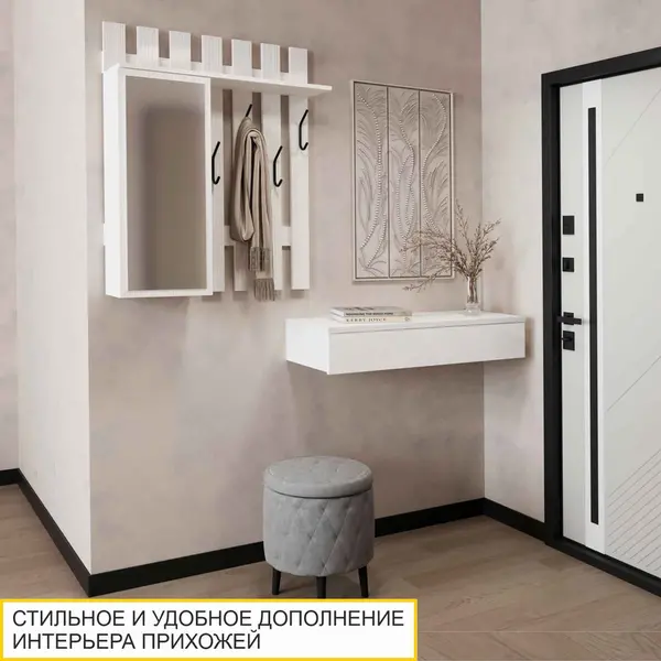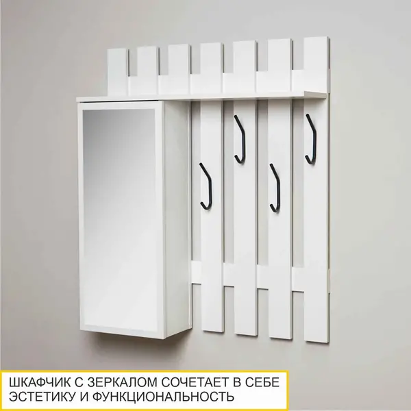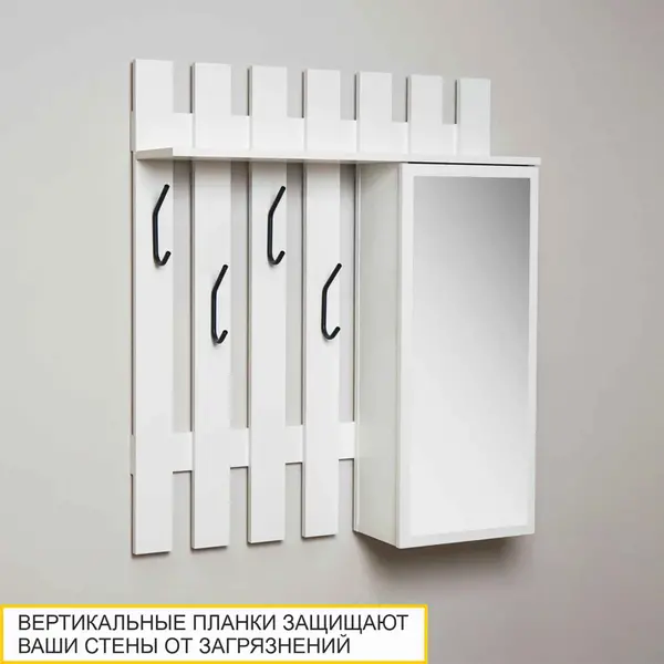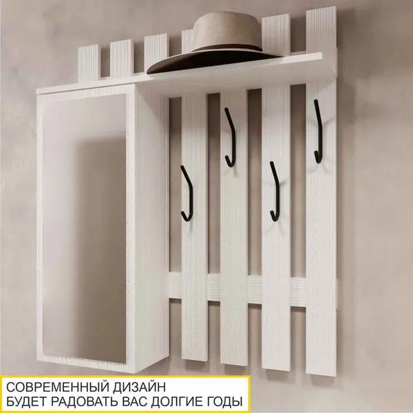 Вешалка выполнена в белом цвете, который является актуальным и универсальным решением. Его можно сочетать с любыми другими цветами и фактурами. В то же время он добавляет интерьеру свежести и визуально расширяет пространство. А имитация натуральной древесной текстуры создает ощущение уюта.