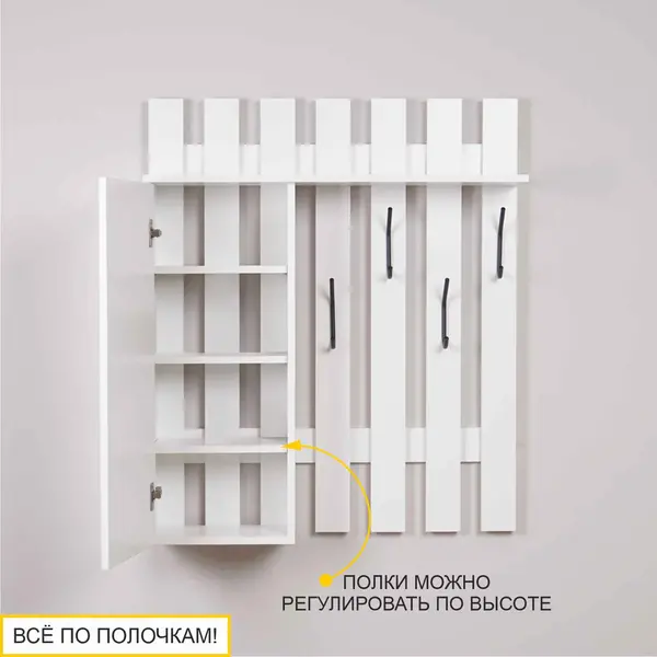 • Вешалка в прихожую оснащена открытой полкой, что обеспечивает дополнительное место для хранения головных уборов и аксессуаров. Полка выдерживает равномерно распределенную нагрузку до 25 кг.