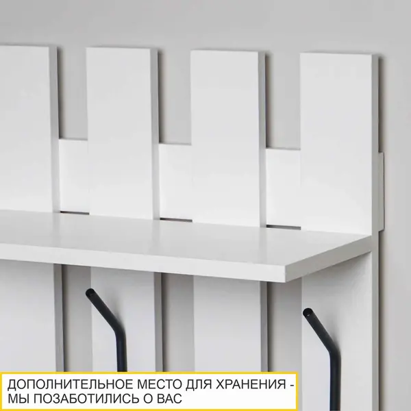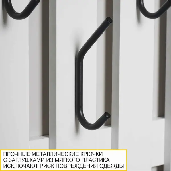 • Прочные металлические крючки стильной формы придают вешалке с полкой эффектный внешний вид. Суммарная нагрузка на крючки - не более 50 кг.