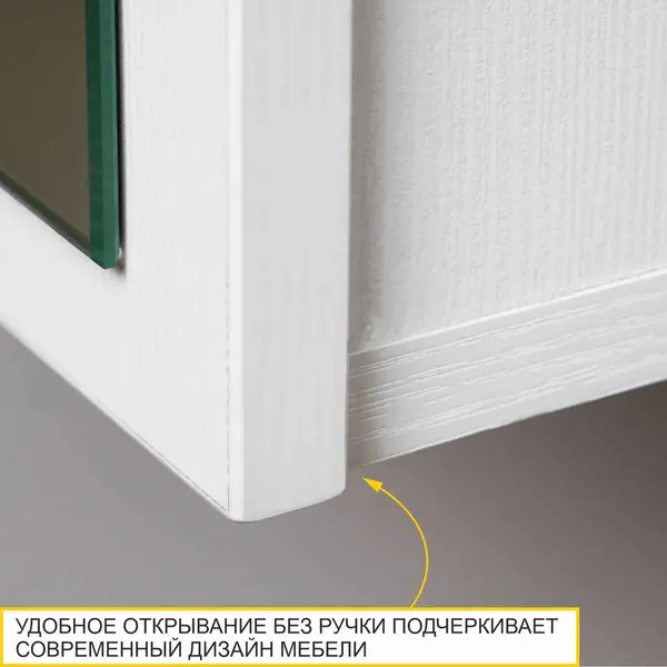 • Шкафчик легко и удобно открывается за счет выступа фасада. Отсутствие ручки подчеркивает современный дизайн мебели. Шкафчик с зеркалом выдерживает нагрузку до 50 кг.