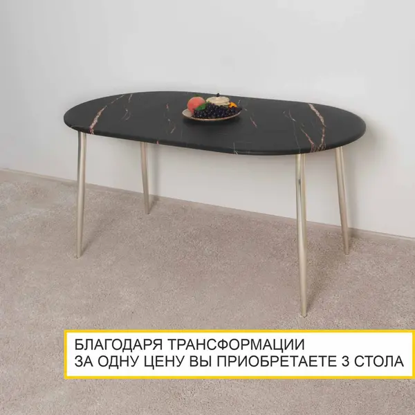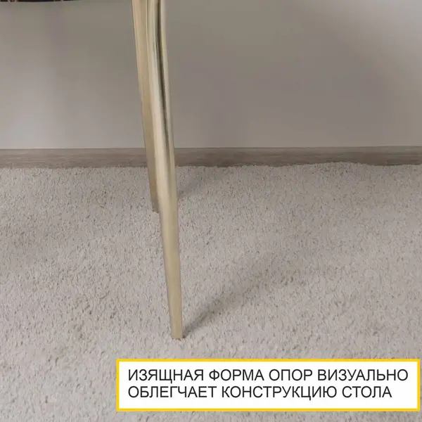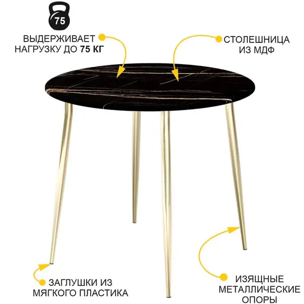 Стол кухонный круглый выполнен в черном цвете, столешница украшена контрастными прожилками разных оттенков, которые образуют изысканный мраморный рисунок. А в сочетании с опорами благородного цвета "белое золото" эта модель создает стильный и элегантный образ.