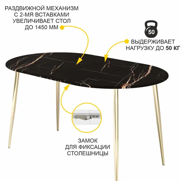• Раздвижной механизм с 2-мя вставками увеличивает размер столешницы на 30 см и на 60 см. Удобно разместить как маленькую, так и большую компанию в любой праздник.