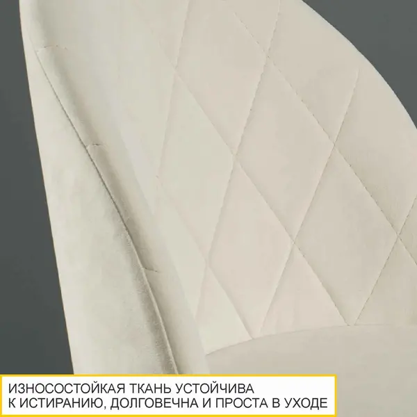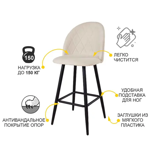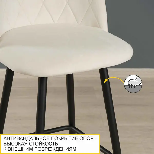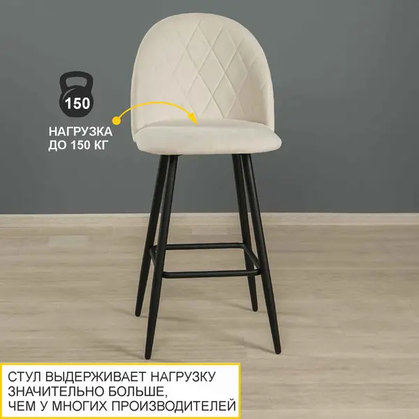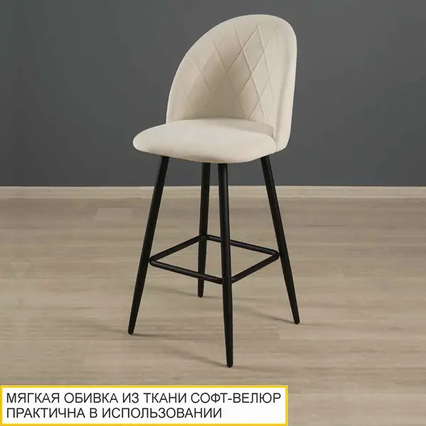 Барный стул выполнен в универсальном светло-бежевом цвете, который выгодно подчеркивает уютную атмосферу интерьера. Светло-бежевый оттенок успокаивает и настраивает на отдых, создавая уют, а приятная на ощупь фактура ткани не оставит Вас равнодушными.