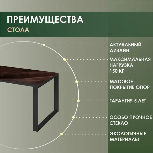 • Особо прочное стекло обеспечивает длительную безопасную эксплуатацию. Чтобы защитить столешницу от воздействия высоких температур, рекомендуем использовать подставку под горячее. Благодаря стеклу рисунок не стирается и не выцветает со временем.