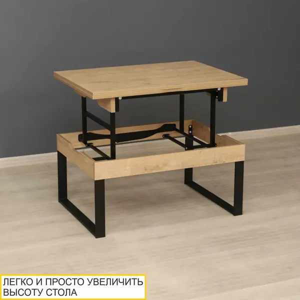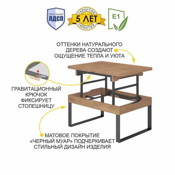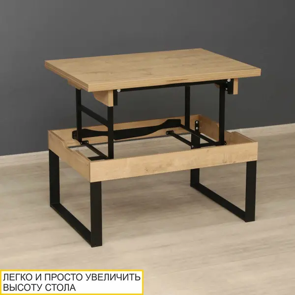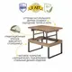 • Уникальный подъемный механизм легко и просто позволяет преобразовать журнальный стол в обеденный, увеличивая высоту до 73 см.