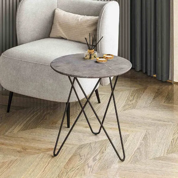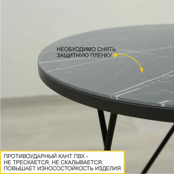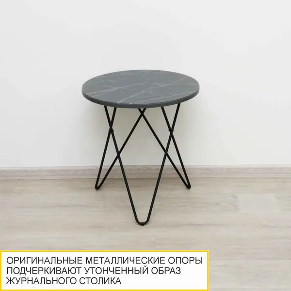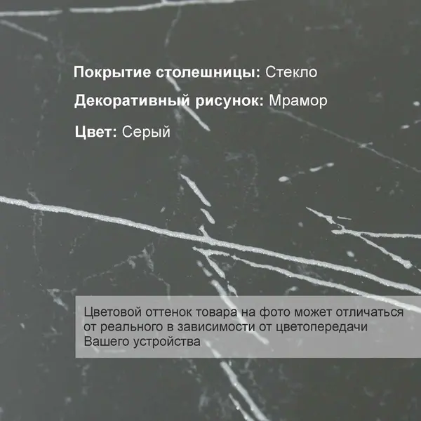 Темно-серый цвет, в котором выполнен столик, является базовым. Он прекрасно сочетается с различными оттенками и может быть с успехом применен в разнообразных стилях. Особое внимание привлекает дизайнерский рисунок «под мрамор» – это прекрасное решение для современного интерьера. Каждая столешница имеет неповторимую многогранность рисунка.
