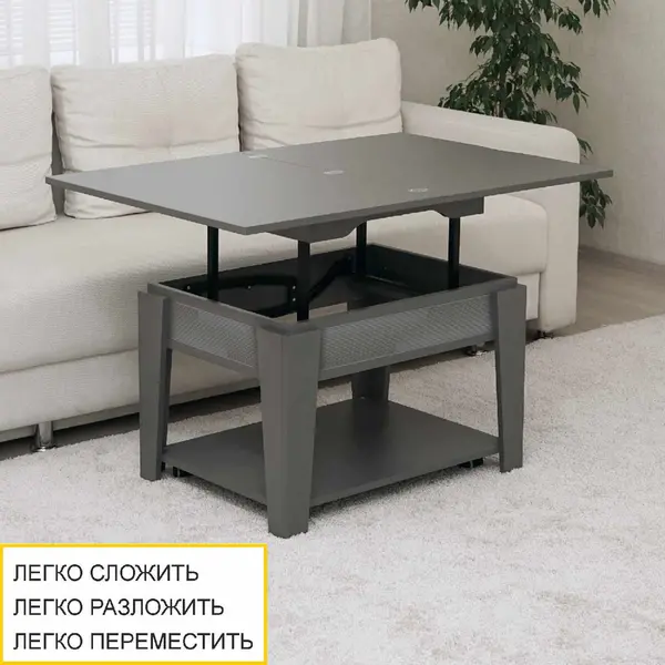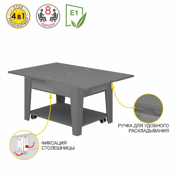 • 4 варианта трансформации позволяют использовать стол как журнальный, обеденный или письменный стол.
