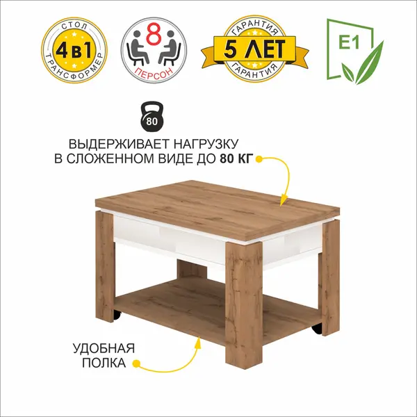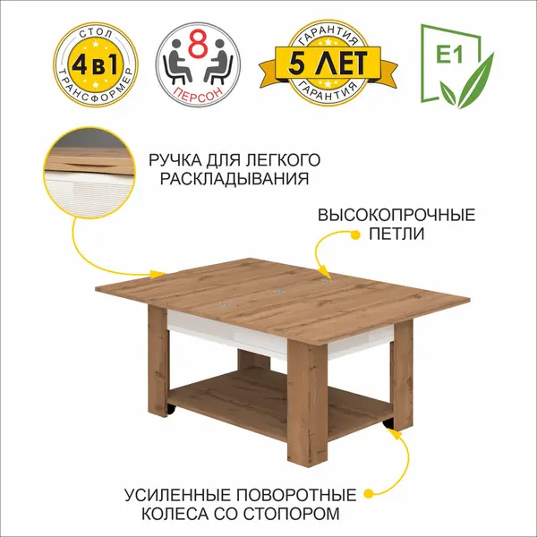 • Стол журнальный на колесиках трансформер выполнен из ЛДСП класса эмиссии Е1. Данный материал безопасен для здоровья и рекомендован к производству мебели для прихожих, спален, гостиных и детских комнат.