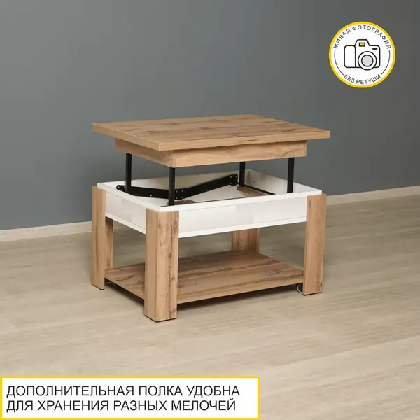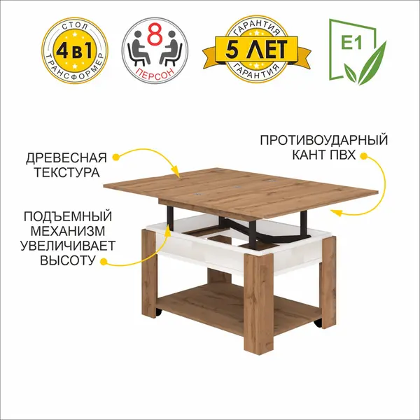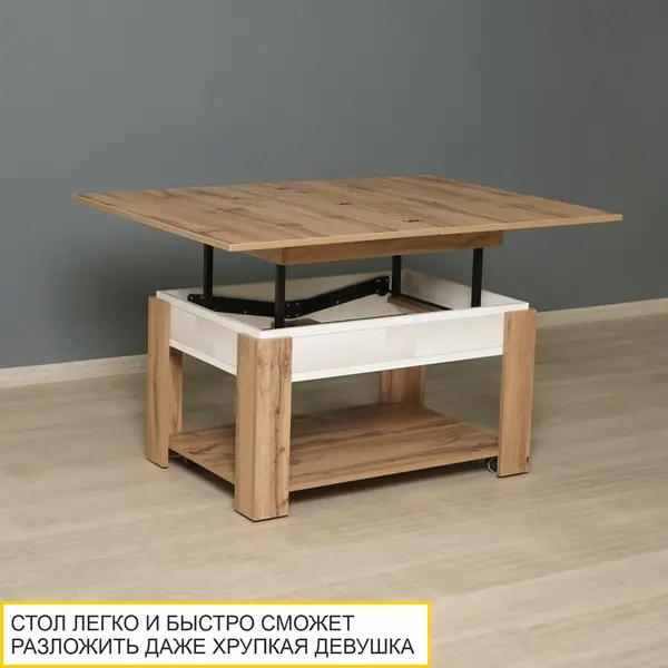 • Подъемный механизм легко и просто позволяет трансформировать журнальный стол в обеденный, увеличивая высоту до 24 см. Благодаря подъемному механизму стол может использоваться как кофейный столик, а также как полноценный стол для кухни или для гостиной.