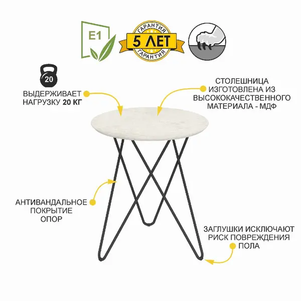 • Стол выполнен из МДФ повышенной прочности. Материал устойчив к механическому истиранию и термическому воздействию. Выдерживает min 200 циклов истирания (по ГОСТу min 65). Это больше, чем у многих производителей.