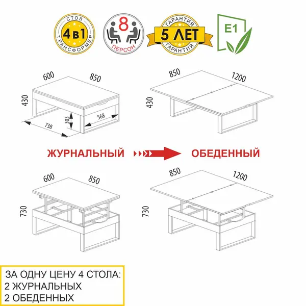 • Раскладной журнальный стол-трансформер легко превращается в обеденный или письменный стол и имеет четыре варианта трансформации. За одну цену Вы покупаете 2 журнальных стола – один компактный, второй с увеличенной столешницей, а так же 2 обеденных стола – на 4 и 8 персон.