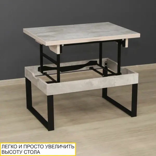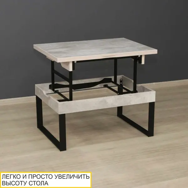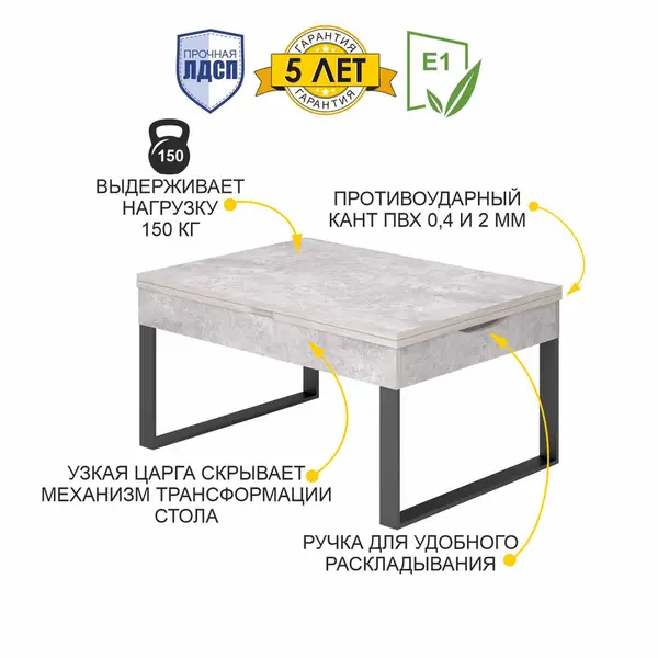• Уникальный подъемный механизм легко и просто позволяет преобразовать журнальный стол в обеденный, увеличивая высоту до 73 см.