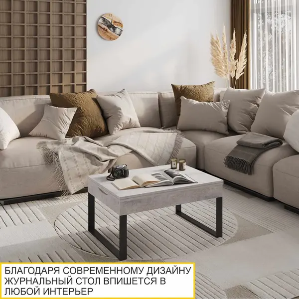 Журнальный стол выполнен в сером цвете с имитацией фактуры цемента – это популярный индустриальный декор, который создает неповторимую стилистику дизайна Вашего пространства. Реалистичная цементная фактура отлично подходит для создания современных интерьерных решений.