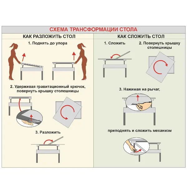 • Удобный механизм трансформации, позволяет легко и быстро разложить стол даже хрупкой девушке.