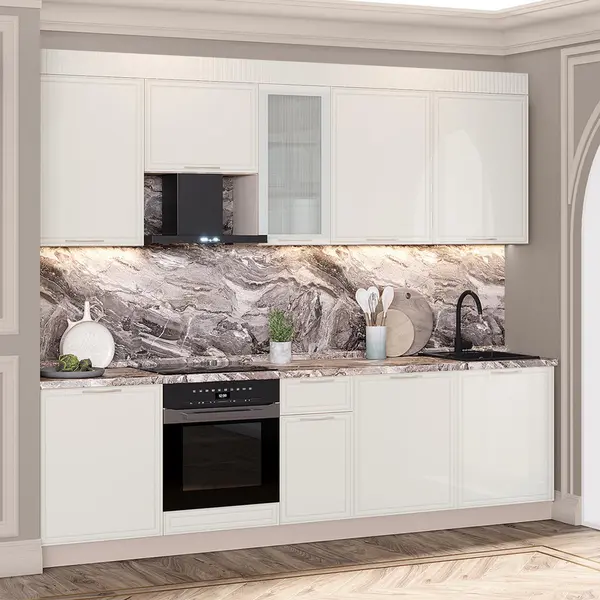 • Цвет «Крем-брюле» создает ощущение простора и воздушности. Глянцевая поверхность фасадов с оригинальной рамкой поддерживает современный стиль.