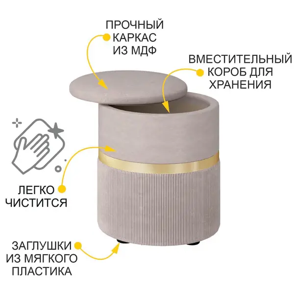 • Мягкая обивка пуфика для туалетного столика выполнена из износостойкой ткани софт-велюр, что обеспечивает комфортное использование. Ткань не требует специального ухода и легко чистится.