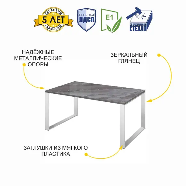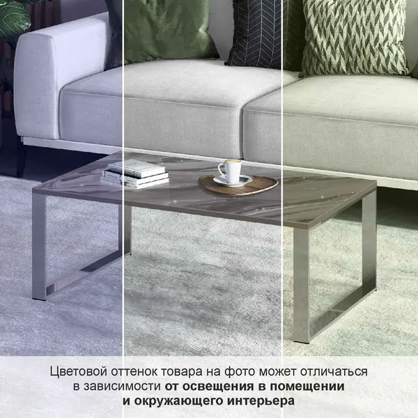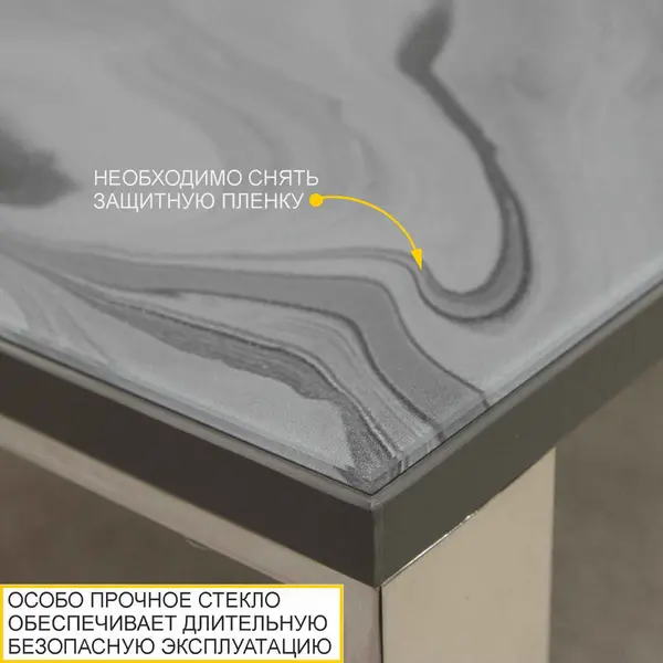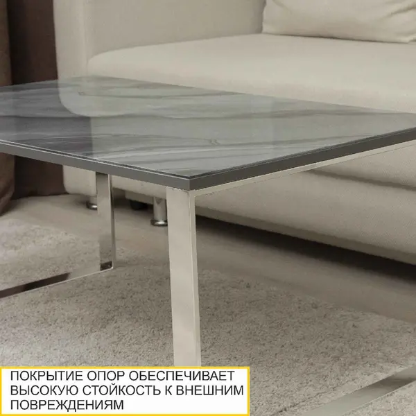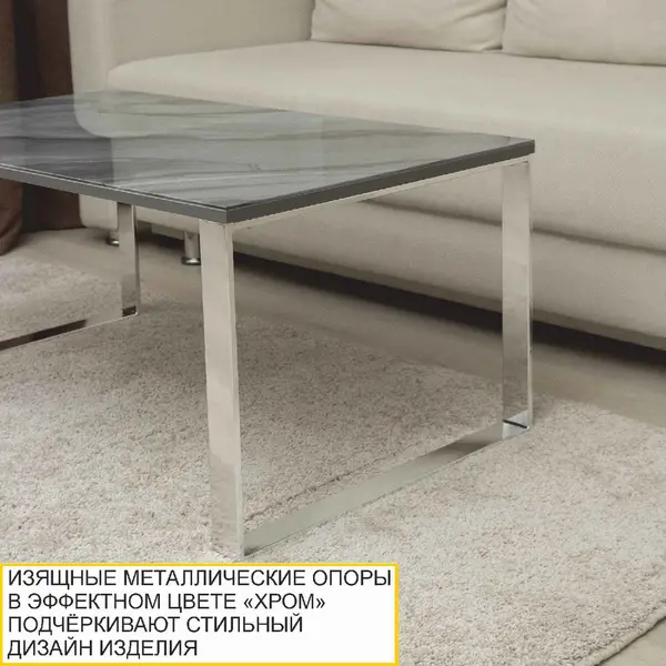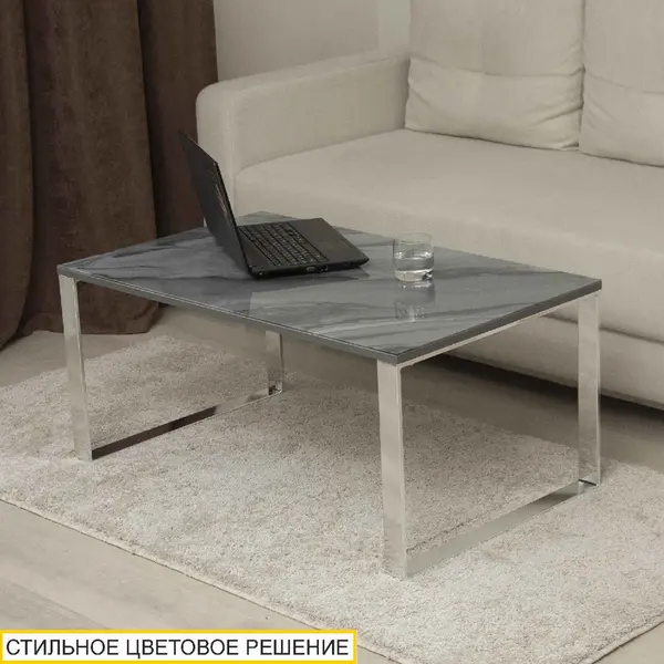 Журнальный стол выполнен в базовом сером цвете. Такой цвет прекрасно сочетается с различными оттенками и успешно применяется в разнообразных стилевых решениях. Стеклянная столешница с дизайнерским рисунком «мрамор» подчеркивает стильный внешний вид изделия и добавляет ему оригинальности. Благодаря стеклу рисунок не стирается и не выцветает со временем.