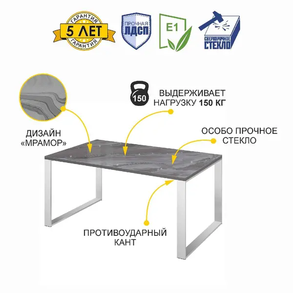 • Стол выполнен из ЛДСП повышенной прочности. Материал устойчив к механическому истиранию и термическому воздействию. Выдерживает многократную разборку и сборку - при переезде не возникнет проблем.