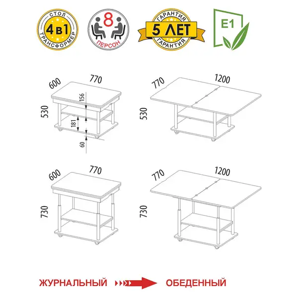 • Раскладной журнальный стол-трансформер легко превращается в обеденный или письменный стол и имеет четыре варианта трансформации. За одну цену Вы приобретаете 4 стола: 2 журнальных – один компактный, второй – с увеличенной столешницей, а также 2 обеденных стола – на 4 и 8 персон.
