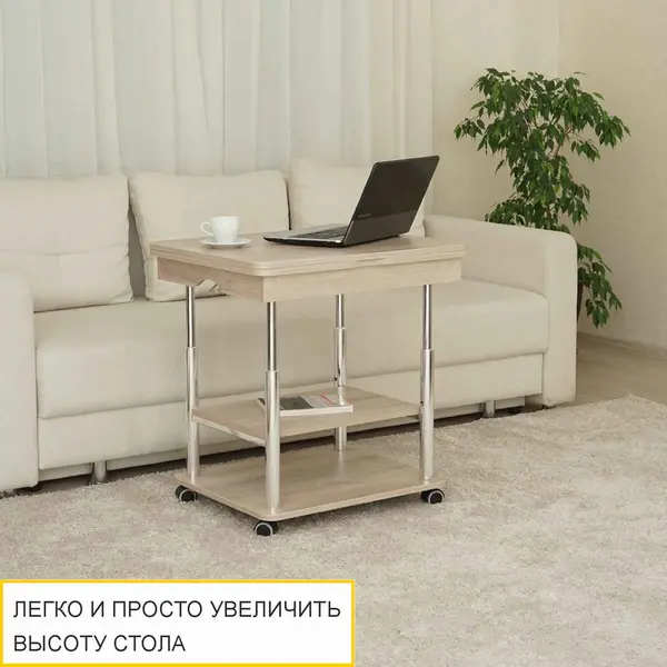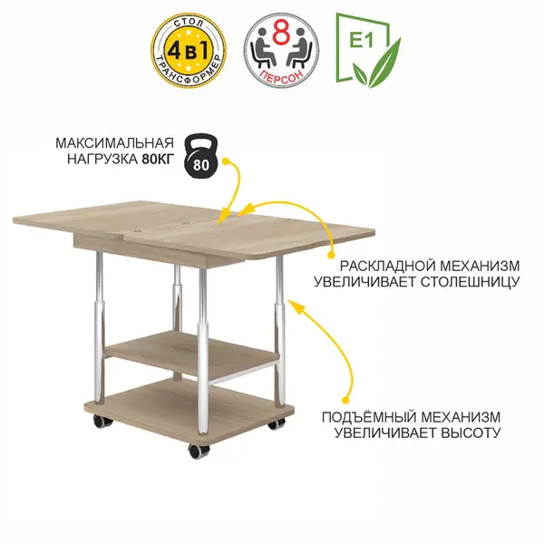 • Подъемный механизм легко и просто позволяет преобразовать журнальный стол в обеденный, увеличивая высоту до 73 см. Благодаря подъемному механизму стол может использоваться как кофейный столик, а также как полноценный стол для кухни или для гостиной.