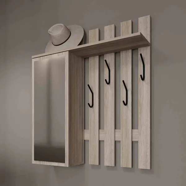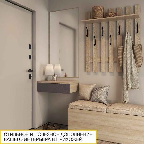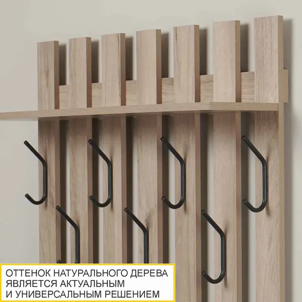 Серо-бежевые оттенки натурального дерева, в которых выполнена вешалка, наиболее универсальны. Они отлично смотрятся в интерьерах любой цветовой гаммы, придают им модную нотку экостиля, а имитация натуральной древесной текстуры создает ощущение уюта.