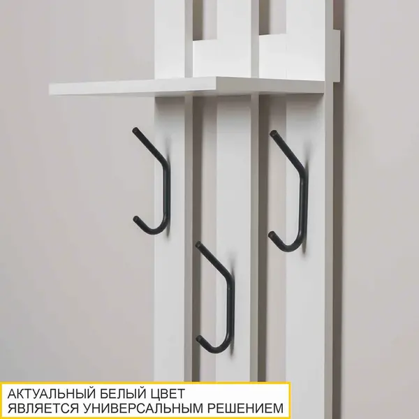 Белый цвет, в котором выполнена вешалка, является актуальным и универсальным решением. Его можно сочетать с любыми другими цветами и фактурами. В то же время он добавляет интерьеру свежести и визуально расширяет пространство, а имитация натуральной древесной текстуры создает ощущение уюта.