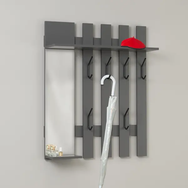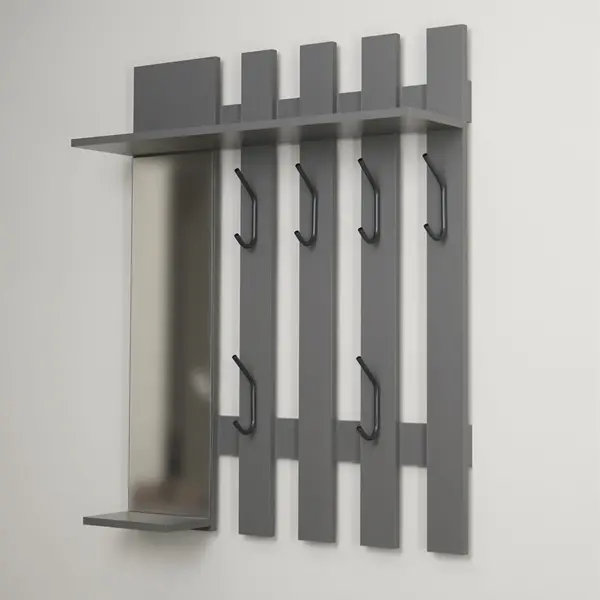 Настенная вешалка выполнена в базовым сером цвете, он прекрасно сочетается с различными оттенками и может быть успешно применен в разнообразных стилевых решениях.