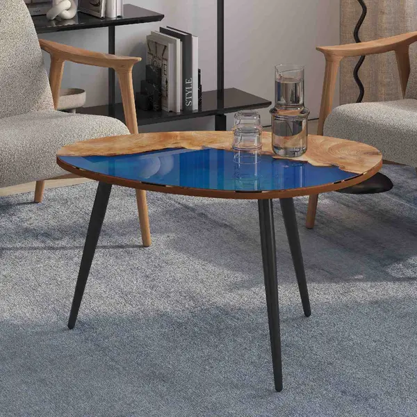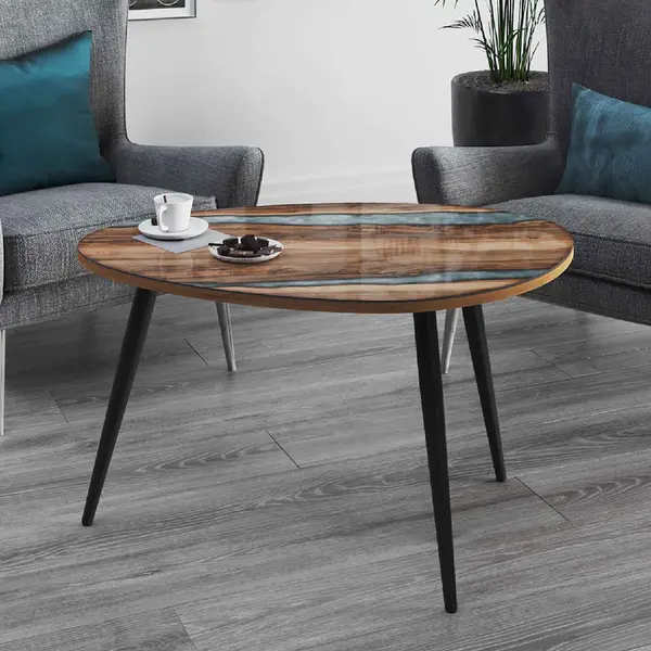 Выдержанный в природной цветовой гамме журнальный столик создает ощущение спокойствия и уюта. Глубокий оттенок ночной реки на столешнице с легким мерцанием отраженных в ней звезд придает интерьеру элегантность и особенный шик. Уникальный дизайн столика в стиле лофт дополняют лаконичные черные опоры.