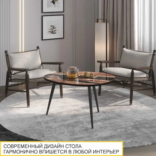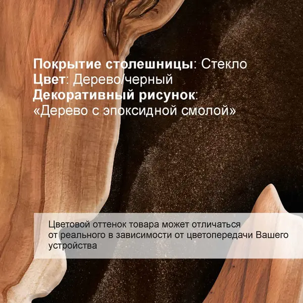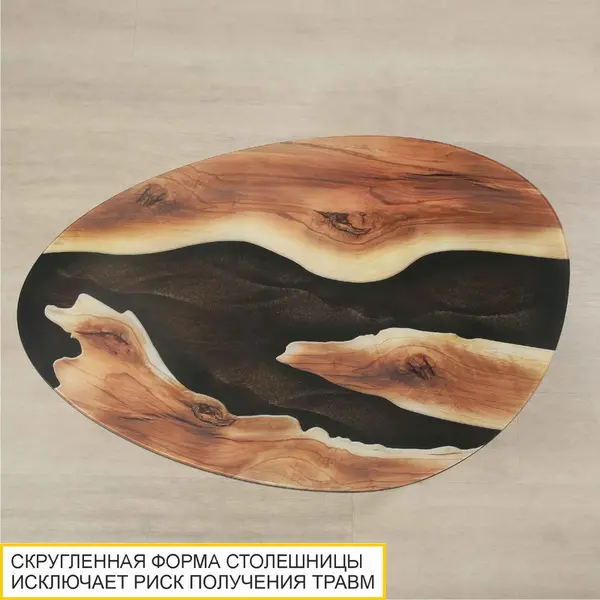 • Стеклянная столешница с древесным рисунком и эффектом «эпоксидной смолы» добавляет журнальному столу оригинальности и придает изделию эксклюзивный внешний вид. Благодаря стеклу рисунок не стирается и не выцветает со временем.