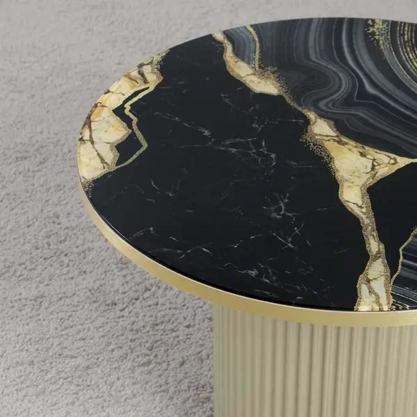 • Россыпь глиттера придает утонченное мерцание дизайнерскому рисунку на столешнице, подчеркивает уникальность журнального столика и привлекает внимание.